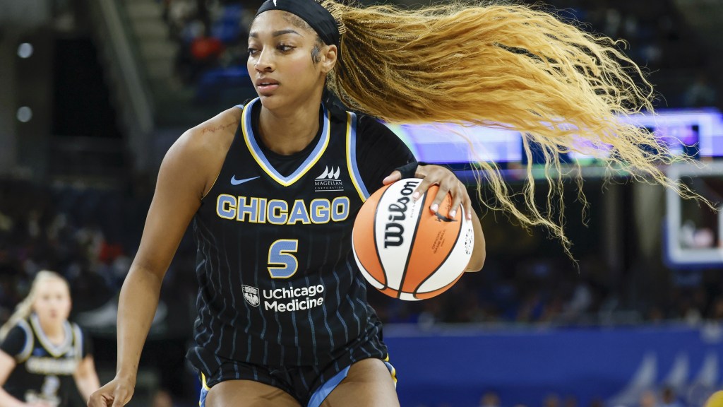 Chicago Sky ahead Angel Reese (5)brings the ball up courtroom towards the Chicago Sky throughout the…